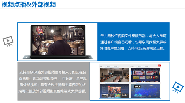 支持視頻點播功能,可選擇獨自播放或同步至大屏或其他參會終端等多種播放方式;