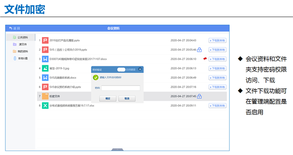 會議資料下載權(quán)限和源文件查看權(quán)限可設(shè)置是否開啟,并支持對會議資料和文件夾設(shè)置密碼權(quán)限訪問;