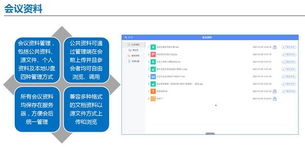 會議資料支持Word、Excel、PPT等類型,還包括TXT、PDF、JPG、BMP、PNG等文檔格式;
