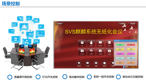 支持中控場景控制功能,主持端可通過隱藏式面板實現(xiàn)對會場各類設(shè)備進行集中控制;